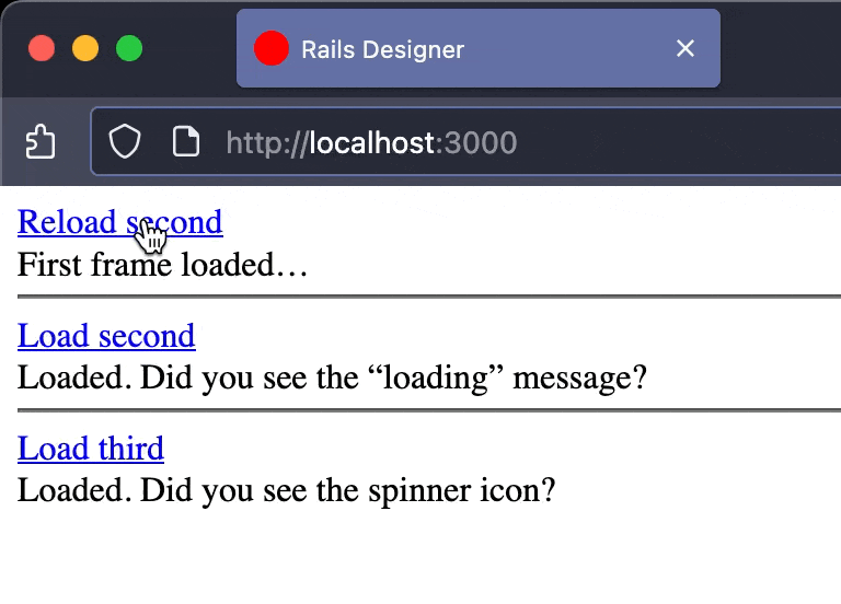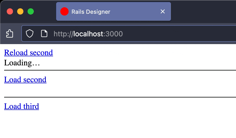 <%= link_to "Load fourth", frame_path(content: "Loaded. Did you see the spinner icon from Rails Icons?", id: "fourth", sleep: 2), data: {turbo_frame: "fourth"} %> <br>
